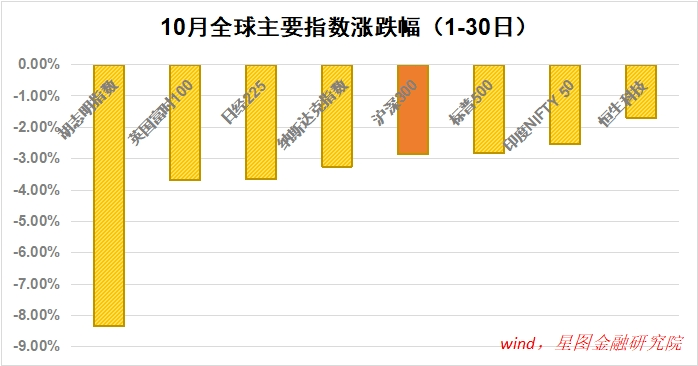 成交量看,10月,沪深两市日均成交额8299亿元,环比9月增长15%,交易情绪明显提升。北向资金月日均净流出27.99亿元,较9月(日均净流出20.81亿元)再次提速,在历史上排第5位,显示外资流出压力依旧较大。