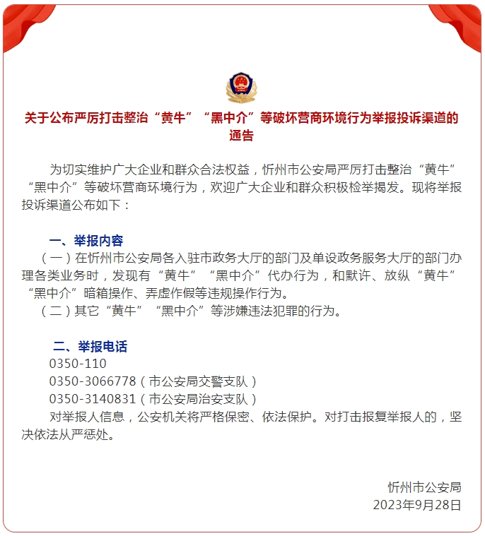 在办理公安交管业务时,若有发现“黄牛”“黑中介”线索可进行举报,举报电话:0350—3066778。也欢迎社会各界对忻州公安交管窗口业务办理过程进行监督。