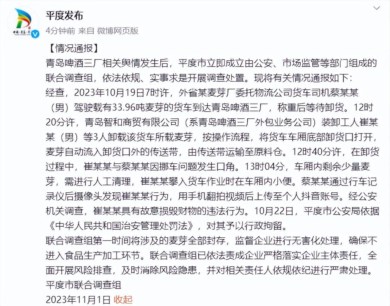 青岛啤酒三厂相关舆情发生后,平度市立即成立由公安、市场监管等部门组成的联合调查组,依法依规、实事求是开展调查处置。现将有关情况通报如下: