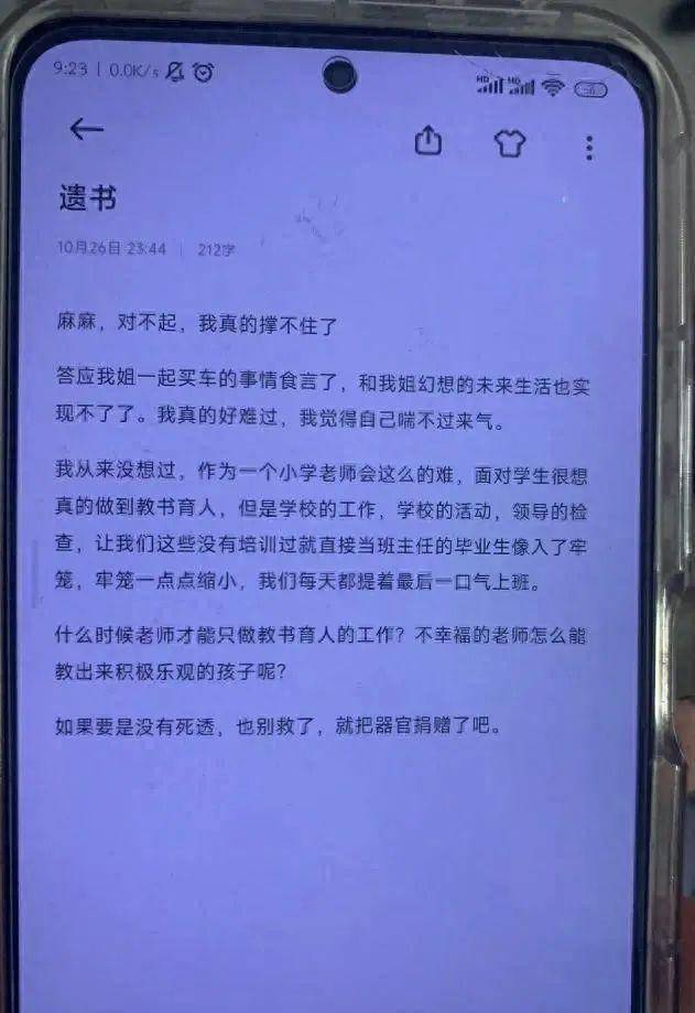 10月31号,郑州管城区建兴路小学一女教师吕某留遗书后去世引关注。家属称,今年23岁的吕某于2022年6月大学毕业,2023年8月考入该校任教并担任班主任,平时性格开朗。家属提供吕某遗书显示,吕某称除教学工作外,应对上级检查,拟写材料等课外行政工作压力大。管城区教体局工作人员称,对此事深感遗憾,相关部门已介入处理此事。