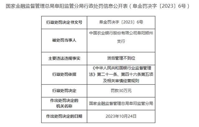 日前,据国家金融监督管理总局阜阳监管分局公布的行政处罚信息,因贷后管理不到位,中国农业银行股份有限公司阜阳颍州支行(下称农业银行阜阳颍州支行)被罚30万元。