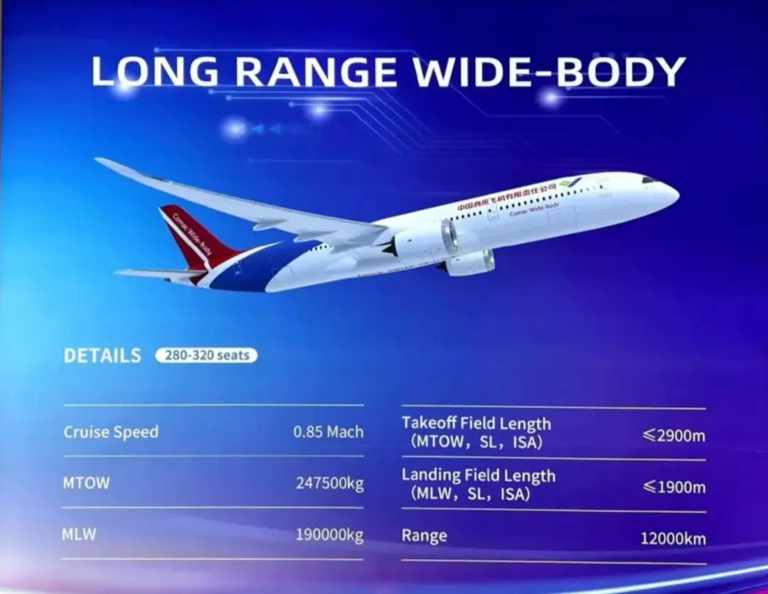 在2023年6月举行的法国巴黎航展上,中国商飞展出了一夸未来宽体大型客机,展板上的介绍为“远程宽体机”,这架双通道宽体客机可以容纳280到320名乘客,航程达到12000公里,瞄准了美国波音787和欧洲空客A350所占据的市场。