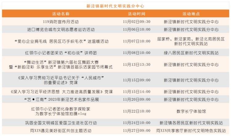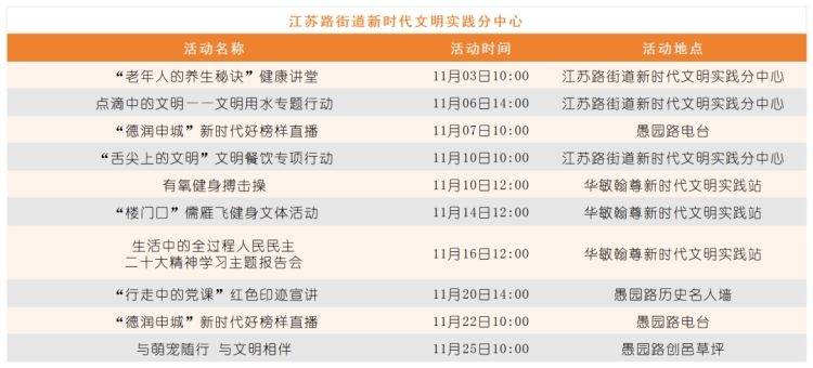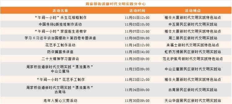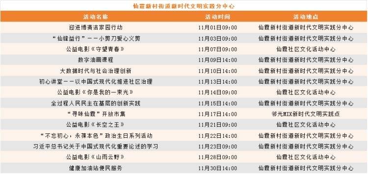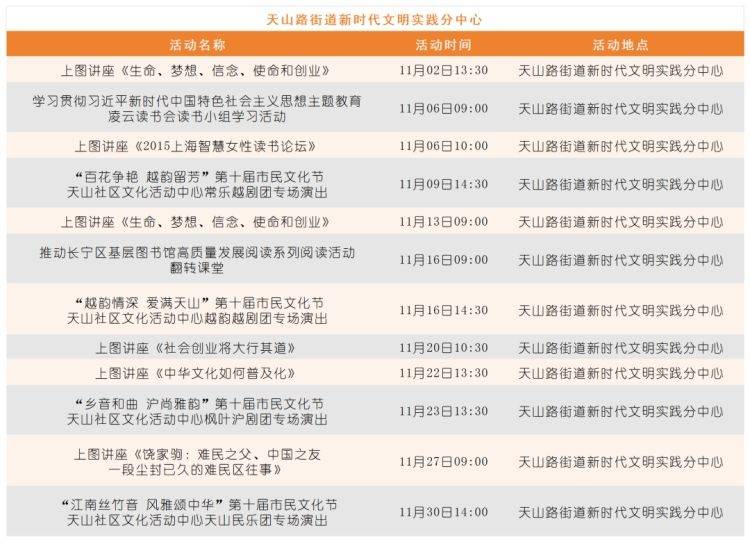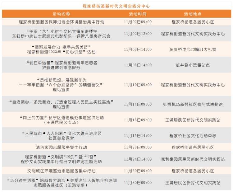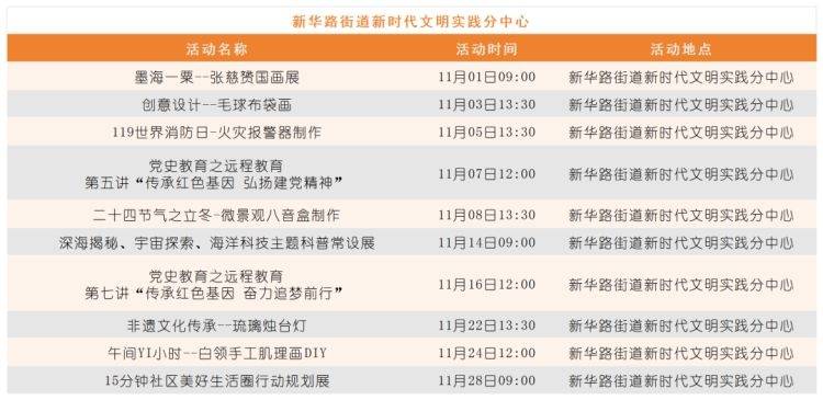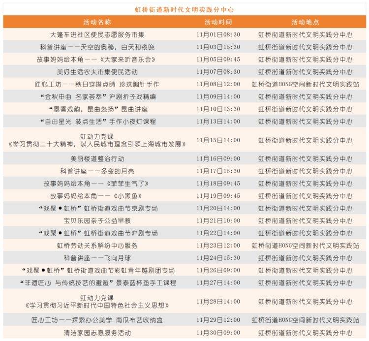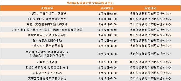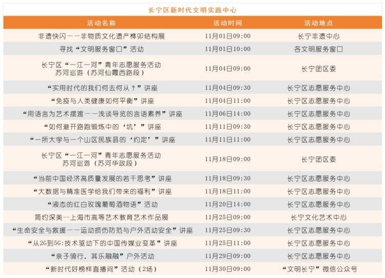 消防安全宣传活动、护航进博志愿服务……长宁区各街镇分中心结合十一月里各种热点,推出了相关活动。与此同时,传统戏曲专场、各类公益活动、主题讲座等,将继续丰富市民们的社区生活。