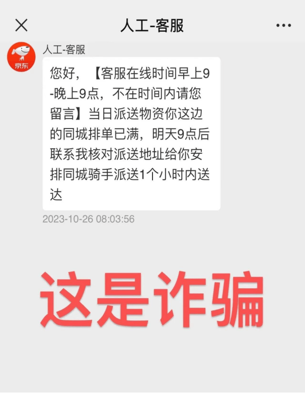 骗子冒充电商或物流客服工作人员,谎称受害人购买的商品有质量问题或是快递丢失,要进行退赔。而后发送虚假链接或二维码,诱导填写个人敏感信息,要求缴纳各种费用。