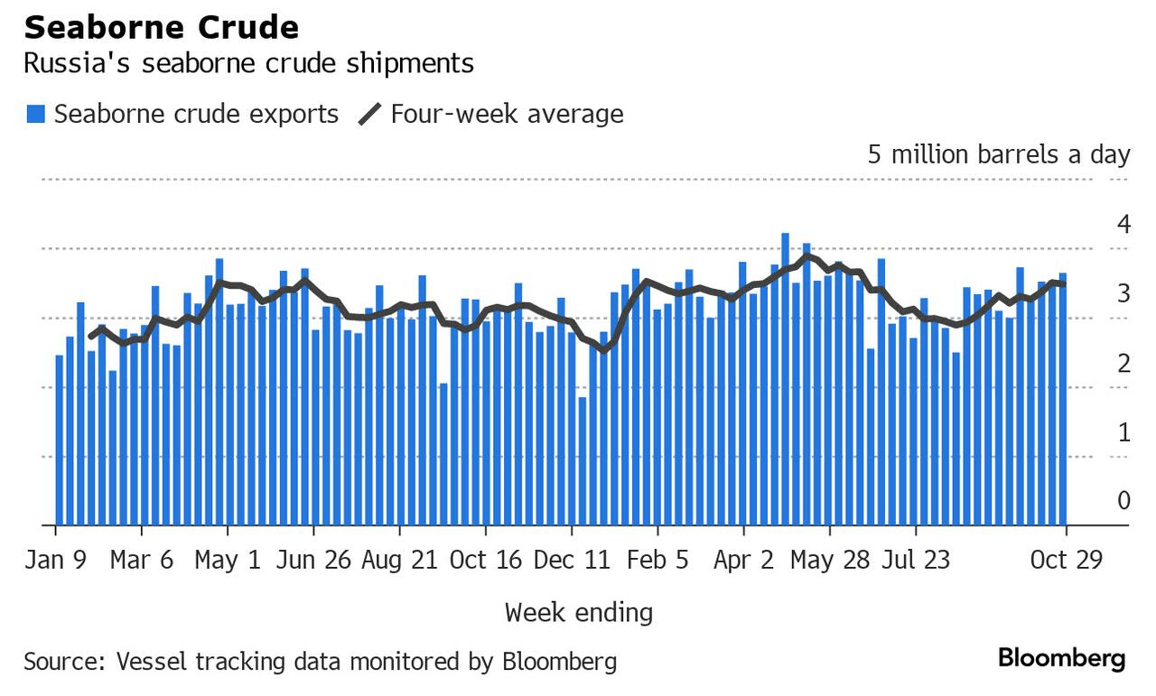 外媒指出,即使在截至10月29日的四周内,平均出口量略低于348万桶/天,也比俄罗斯为履行其削减出口量30万桶/天的承诺而必须坚持的理想出口量高出近20万桶/天。