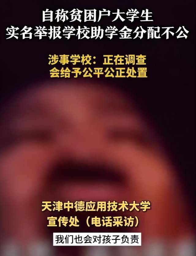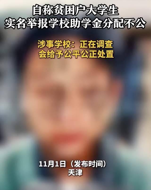 11月1日,据荔枝新闻报道,近日,天津一大学生实名举报助学金分配不公,据其称9月班级举行助学金评比,共4个名额,作为建档立卡贫困户的他,往年都在列,今年却被一名经济状况并不困难的同学给挤了下来。