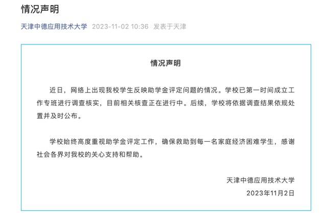 近日,一名自称天津中德应用技术大学的学生实名举报学校助学金分配不公。11月2日,校方对此通报称,学校已第一时间成立工作专班进行调查核实,目前相关核查正在进行中。