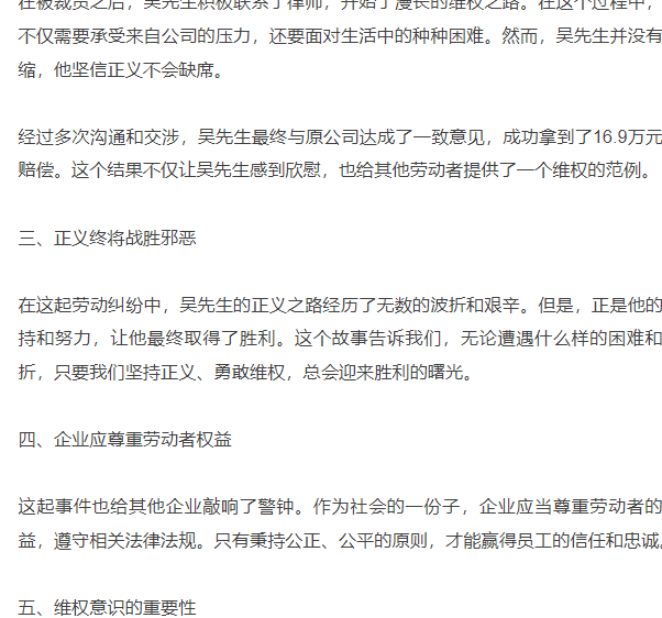 吴先生的故事是一个鼓舞人心的例子,他用自己的行动证明了正义的力量是无穷的。希望更多的劳动者能够像他一样,勇敢地维护自己的权益,让社会更加公正、公平。同时,也希望企业能够遵守法律法规,尊重劳动者的尊严和权益,共同构建一个和谐的社会环境。