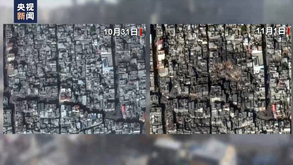 还有卫星图片展示了从10月31日到11月1日,杰巴利耶难民营遭以军空袭前后的图像对比。可以看到,空袭过后,遭袭区域一片狼藉,现场留下巨大的弹坑。