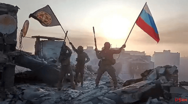 【在巴赫穆特市中心上摇旗的瓦格纳雇佣兵】