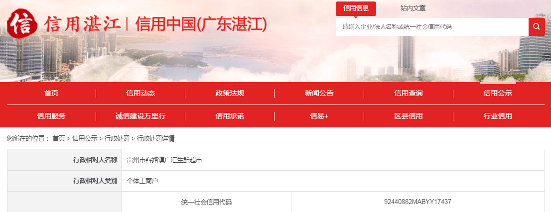 | 行政相对人名称 | 雷州市客路镇广汇生鲜超市 | |||