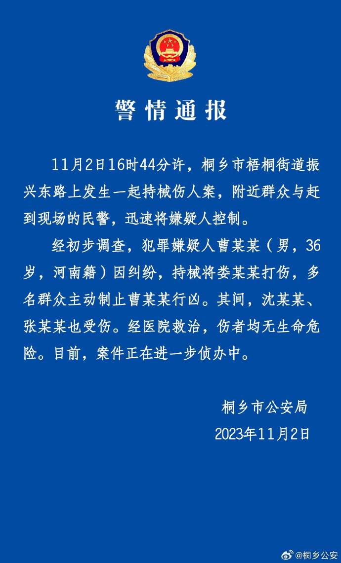 11月2日晚,桐乡公安发布警情通报:11月2日16时44分许,桐乡市梧桐街道振兴东路上发生一起持械伤人案,附近群众与赶到现场的民警,迅速将嫌疑人控制。经初步调查,犯罪嫌疑人曹某某(男,36岁,河南籍)因纠纷,持械将娄某某打伤,多名群众主动制止曹某某行凶。其间,沈某某、张某某也受伤。经医院救治,伤者均无生命危险。目前,案件正在进一步侦办中。