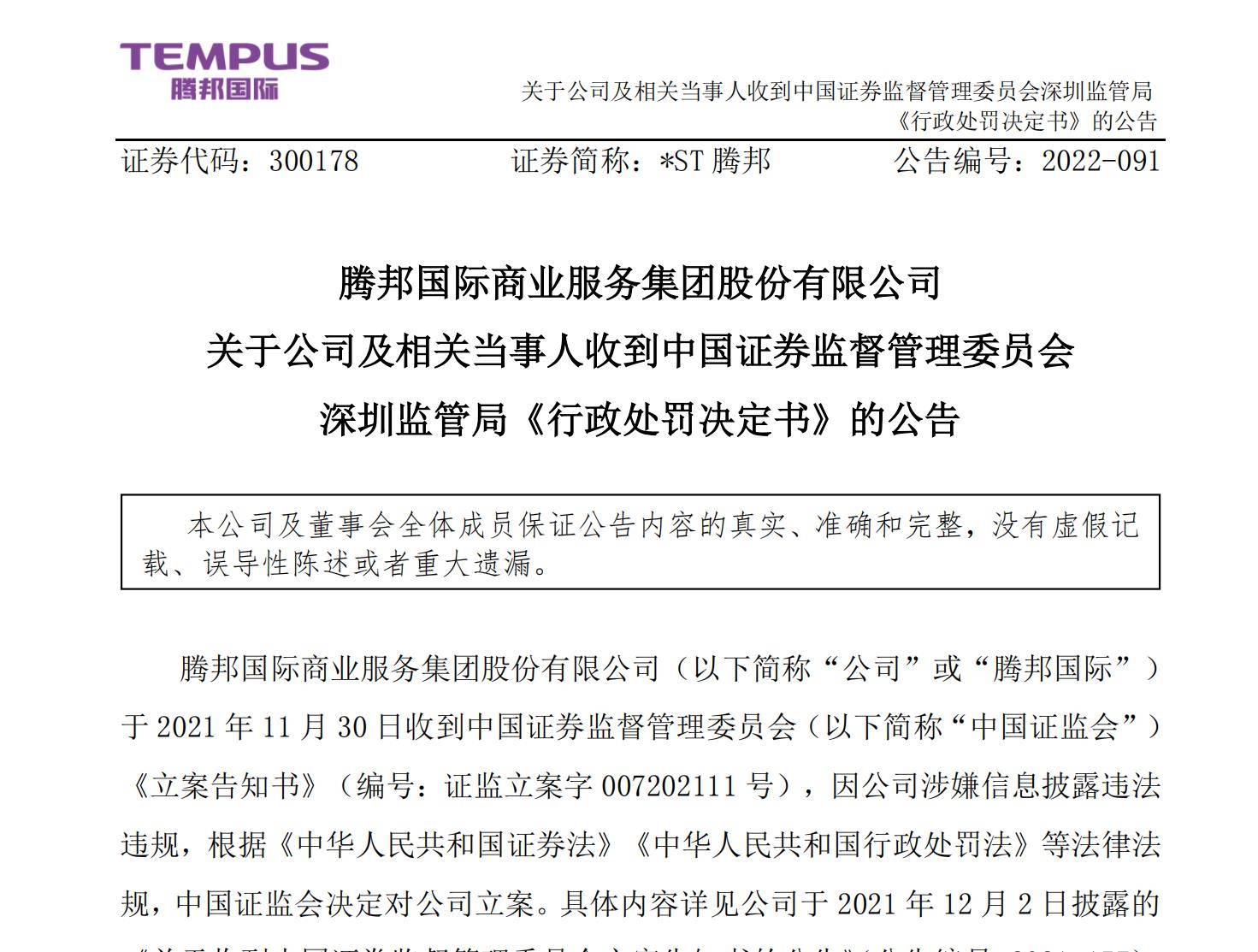 2022年5月5日,腾邦国际商业服务集团股份有限公司(简称公司或腾邦国际)被中国证监会行政处罚。