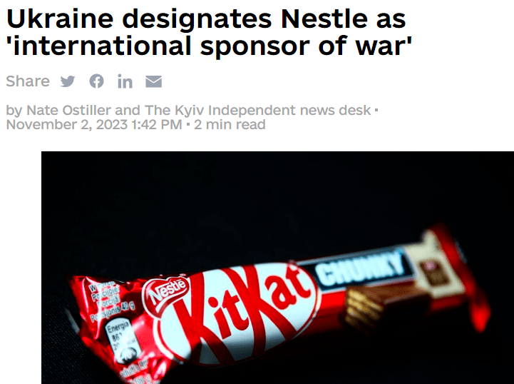 据法新社和《基辅邮报》等媒体11月2日报道,由于不满雀巢公司继续在俄罗斯运营,乌克兰当天将这家瑞士食品巨头列入“战争赞助商”名单。