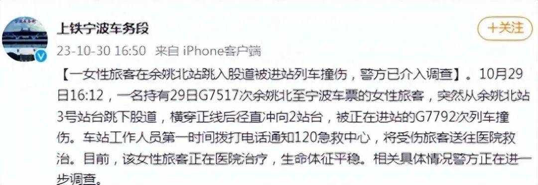 通报称,29日16时许,一名女性旅客突然从余姚北站3号站台跳下股道,横穿正线后径直冲向2站台,被正在进站的列车撞伤,随后被车送往医院救治。