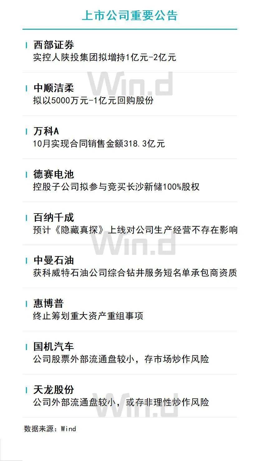 6、据证券时报,近一段时间以来,市场主体纷纷开启增持、自购等,提振投资者信心,稳定市场预期。11月2日,富国基金公告,将于近日运用固有资金合计2亿元投资旗下权益类公募基金,这也是两个多月时间内,富国基金第二次出手自购。与此同时,A股公司增持回购继续“刷屏”,有公告实际控制人回购提议的,还有的披露回购报告书,更多的企业在披露增持回购进展。