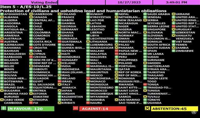 对这个结果,美国和以色列都一定有心理准备,但让以色列恼怒的是,七国集团中只有美国反对,5国弃权,法国投赞成票,五眼联盟之一的新西兰也赞成,与美国关系紧密的日本、韩国,从西方获得无数好处的印度,传统的西方国家比利时、挪威、西班牙、爱尔兰等国也全部赞成,波兰和德国弃权。