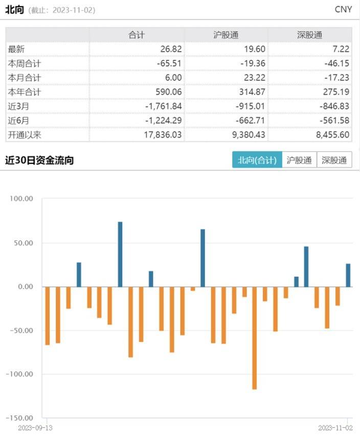 11月2日A股盘初冲高回落,随后陷入缩量整理,上证指数跌0.45%报3009.41点,深证成指跌0.94%报9734.77点。量能方面,市场成交额7682.4亿元,小幅缩量;北向资金实际净买入26.82亿元,其中沪股通净买入19.6亿元,深股通净买入7.22亿元。盘面上,传媒板块领涨,游戏、影视上涨较多;银行、石油板块飘红。军工回调较多。