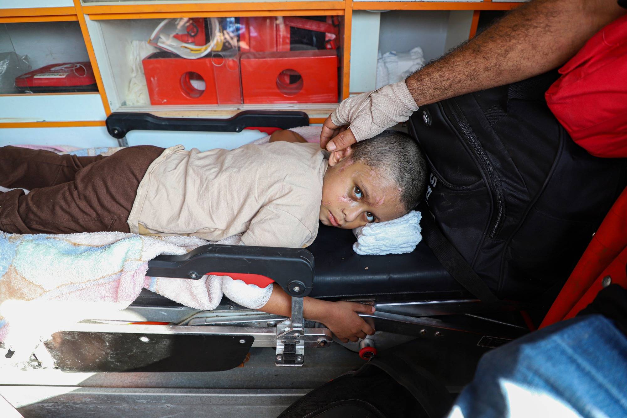 11月1日,受伤人员在拉法口岸加沙一侧的救护车中等待前往埃及。新华社发(里泽克·阿卜杜勒贾瓦德摄)