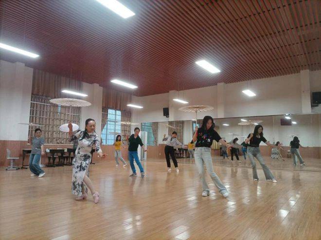每周星期四都是她们开展活动的时间,一批热爱舞蹈、当天下午又没课的教师相聚在舞蹈房,在光洁的木地板上铺上瑜伽垫,在光滑的木栏杆上压腿。随后在舞蹈教师穆瑶和李紫琦的带领下,学习各种舞蹈。