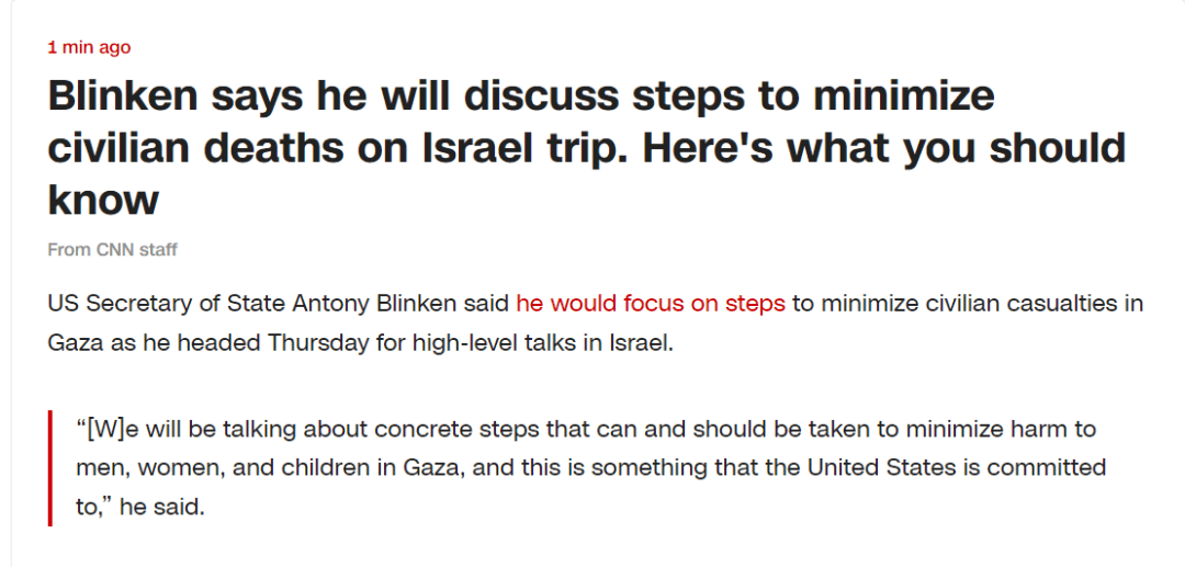 CNN称,拜登、国防部长奥斯汀和国务卿布林肯最近在与以色列方面的私人谈话中都明确强调了这个问题。他们警告,外界对以色列支持的削弱,将对以色列国防军打击哈马斯的行动产生可怕的战略后果。与此同时,美国官员也相信,在人道主义苦难、平民伤亡以及停火的呼声达到临界点之前,以色列试图实现其在当前行动中消灭哈马斯的既定目标的时间是有限的。美国政府内部承认,这一时刻可能很快到来:一些拜登的亲密顾问认为,以色列只有几周时间,而不是几个月。