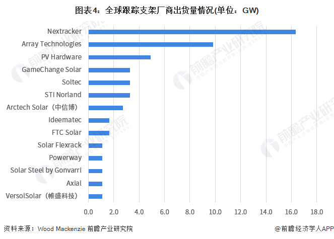 根据世界权威能源调研机构Wood Mackenzie统计数据,2021年全球跟踪器出货量达到54.5GW,同比增长率达到23%。其中NEXTracker位居榜首,跟踪支架出货量超过16GW。