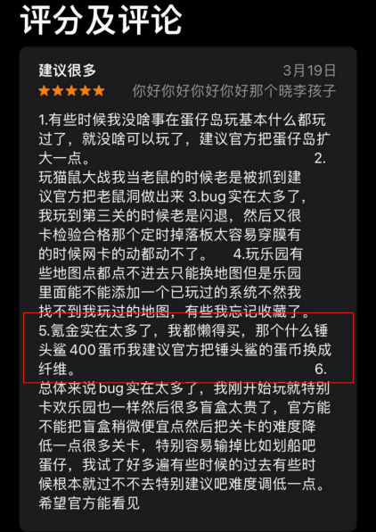 从苹果手机的软件商城可以看到,“蛋仔派对”的游戏年龄分级为9岁以上,华为商城的推荐年龄则为18岁以上。在不同系统的游戏软件评论中,都有用户提到“氪金(网络游戏中的充值行为)严重”的问题。