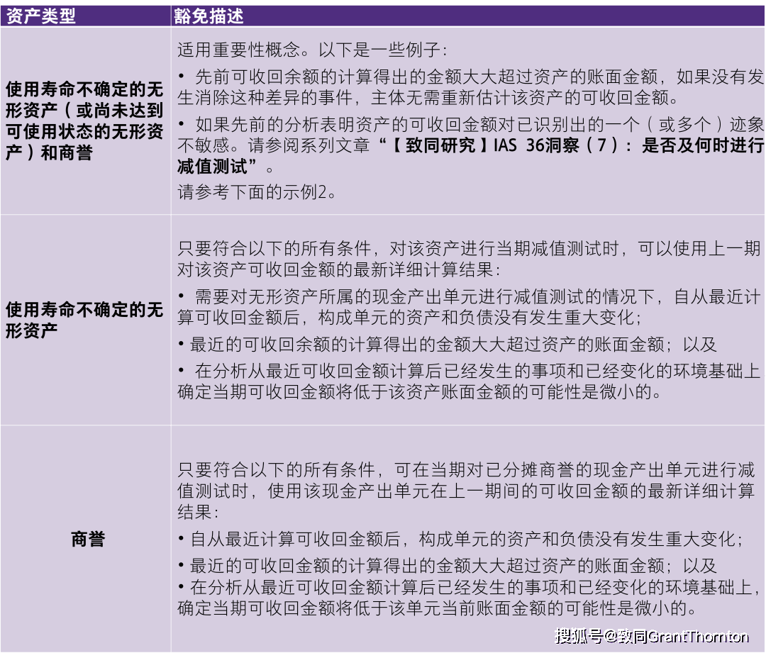 在某些情况下,当已识别出某一迹象或到了年度减值测试日期时,IAS 36还提供了豁免计算可收回金额的规定。下表总结了IAS 36中适用于无形资产和商誉的豁免规定。广义上讲,这些豁免规定指出了在确定需要估计可收回金额时,适用重要性概念。