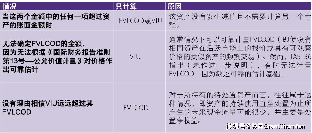 尽管可收回金额被定义为公允价值减处置费用(FVLCOD)与其使用价值(VIU)两者之中的较高者,但IAS 36明确指出,并不总是需要同时确定这两个估计值。下表列出了只需要计算FVLCOD或VIU的情况。