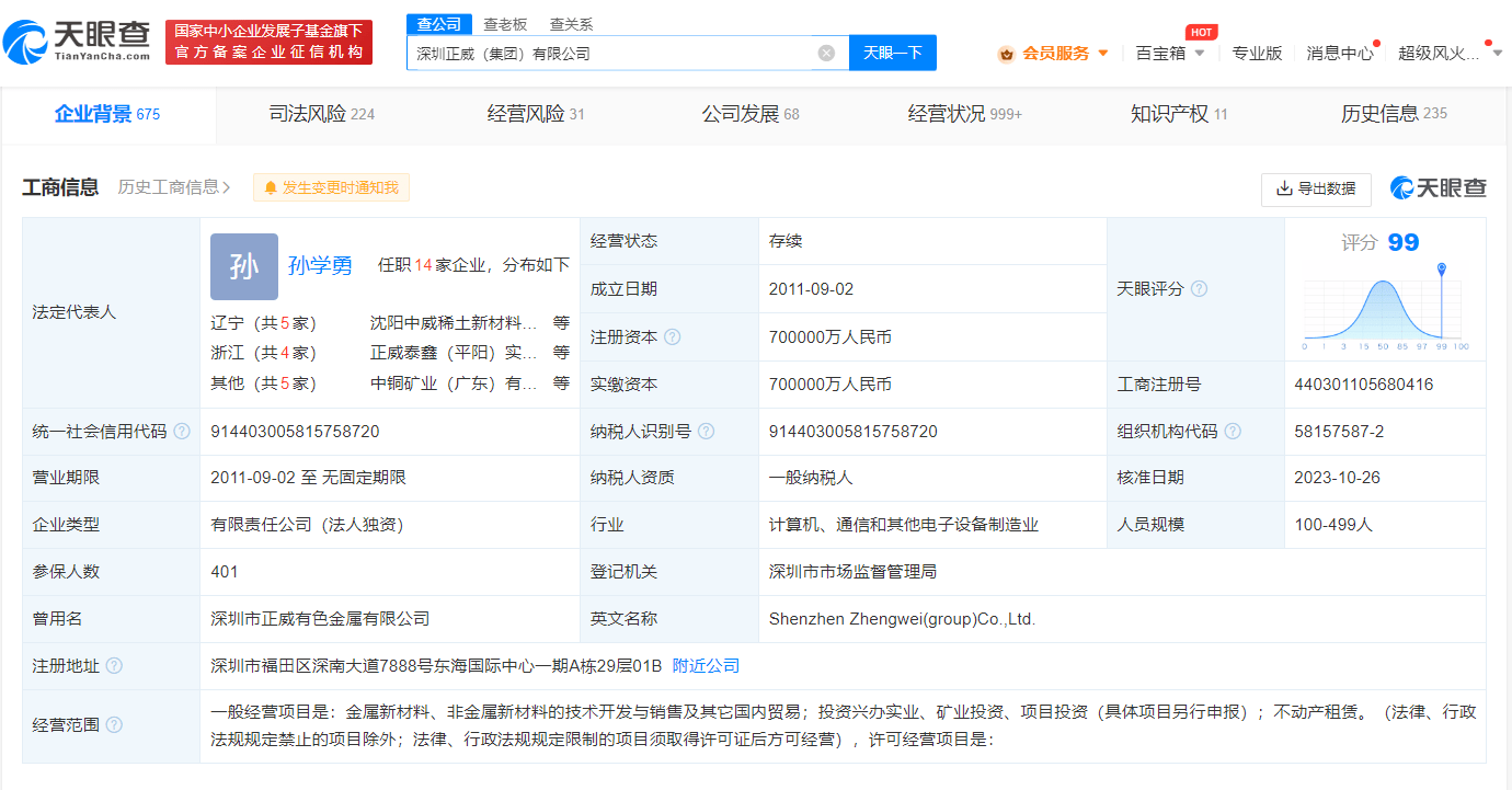深圳正威(集团)有限公司法定代表人为孙学勇,注册资本70亿人民币,经营范围包括金属新材料、非金属新材料的技术开发与销售及其它国内贸易,投资兴办实业、矿业投资、项目投资等,由正威控股集团有限公司全资持股。