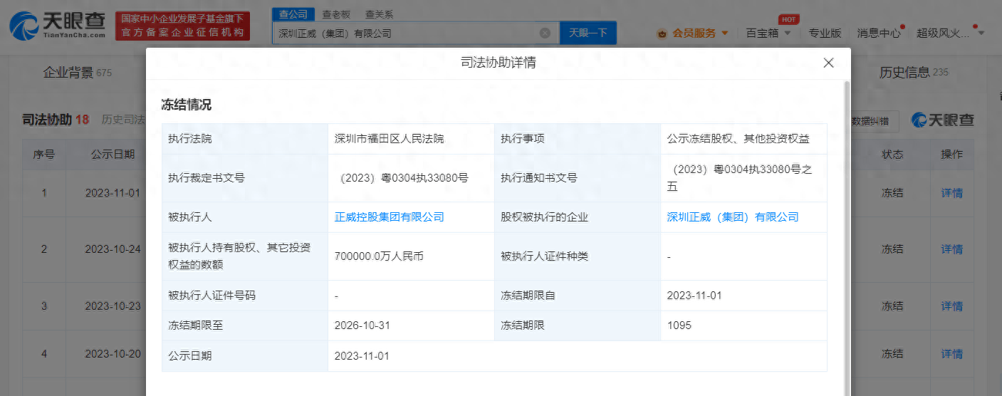【大河财立方消息】天眼查App显示,近日,深圳正威(集团)有限公司新增一则股权冻结信息,被执行人为正威控股集团有限公司,冻结股权数额70亿人民币,冻结期限自2023年11月1日至2026年10月31日,执行法院为深圳市福田区人民法院。