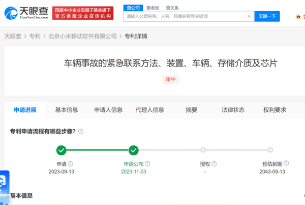 【CNMO新闻】11月3日,CNMO注意到,天眼查App显示,北京小米移动软件有限公司申请的“车辆事故的紧急联系方法、装置、车辆、存储介质及芯片”专利公布。这一专利旨在通过与事故等级对应的通知方式,及时将事故信息发送给车辆预设的紧急联系人,从而保证车内人员能得到及时救援。