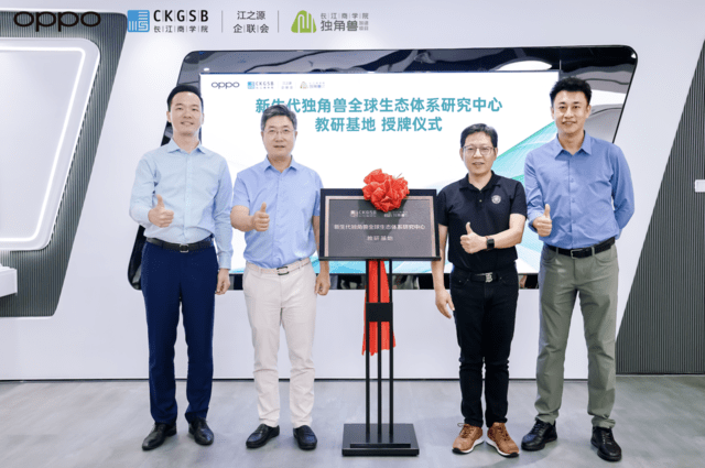 2023年10月27日,中国深圳——OPPO携手长江商学院举办新生代独角兽全球生态体系研究中心教研基地授牌仪式。长江商学院战略学教授、副院长、长江独角兽研究中心主任滕斌圣,OPPO副总裁、传习院副院长吴强共同为教研基地授牌。