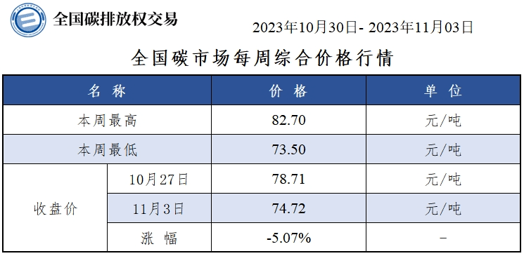 上证报中国证券网讯 据上海环境能源交易所消息,本周全国碳市场综合价格行情为:最高价82.70元/吨,最低价73.50元/吨,收盘价较上周五下跌5.07%。