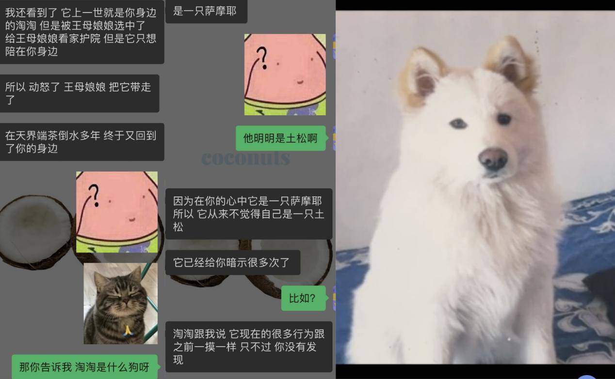 这位宠物沟通师表示:“它(指吐吐)上一世就是‘淘淘’,被王母娘娘选中了,给王母娘娘看家护院,但是它只想陪在你身边,在天界端茶倒水多年,终于又回到你身边。”当被问到“淘淘”是什么品种时,宠物沟通师表示,“淘淘”是萨摩耶。博主质疑,对方回复称:“在你心里它是萨摩耶,但它不觉得自己是土松。”