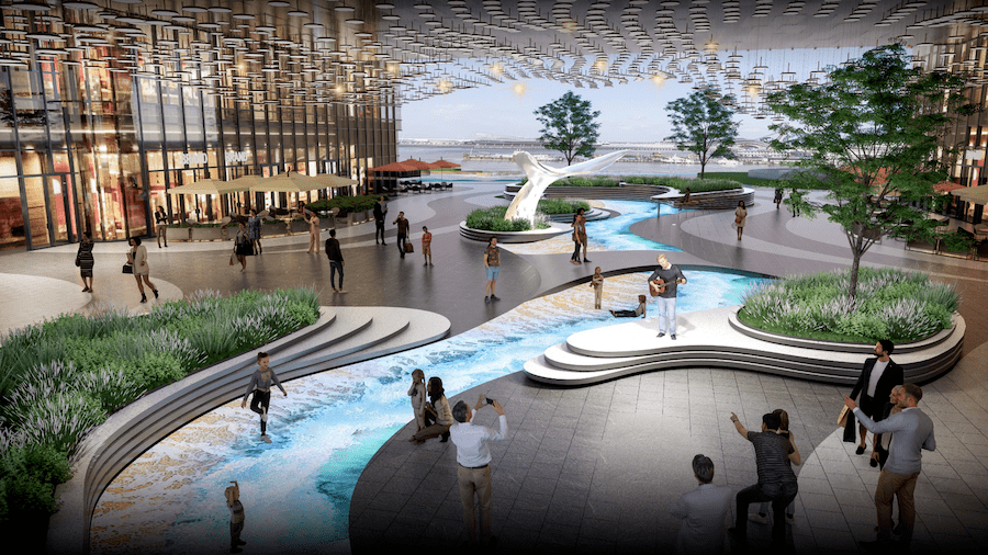 滨水文旅商业则瞄准新世代“年轻、时尚、有趣”的消费态度,以“潮玩运动研究所、早C晚A活力场、宠物社交研习营、全球美食饕餮汇”四大主题场景,串联“艺术长廊、屋顶花园、户外文化长廊”三大特色空间,驱动新消费场景蝶变。
