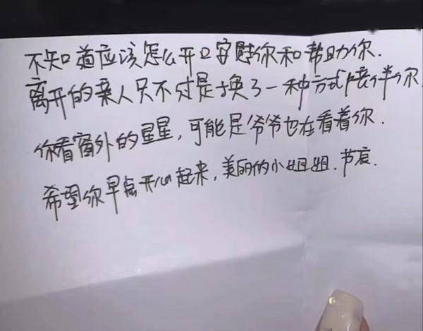 记者了解到,除了刘雅琴,当时还有一名空乘也写了手写信,信里写道:“离开的亲人只不过是换了一种方式陪伴着你,你看窗外的星星,可能是爷爷也在看着你,希望你早点开心起来。”刘雅琴告诉记者,她们都希望为乘客多想一点、多做一点。“或许一个小小的举动,就能给她力量,也会让自己收获一份美好。”