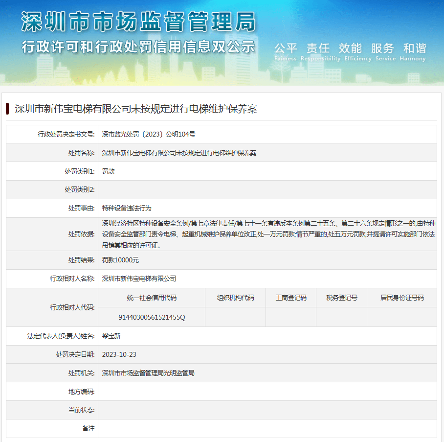 近日,深圳市市场监督管理局光明监管局发布行政处罚信息(深市监光处罚〔2023〕公明104号),涉及深圳市新伟宝电梯有限公司未按规定进行电梯维护保养案。
