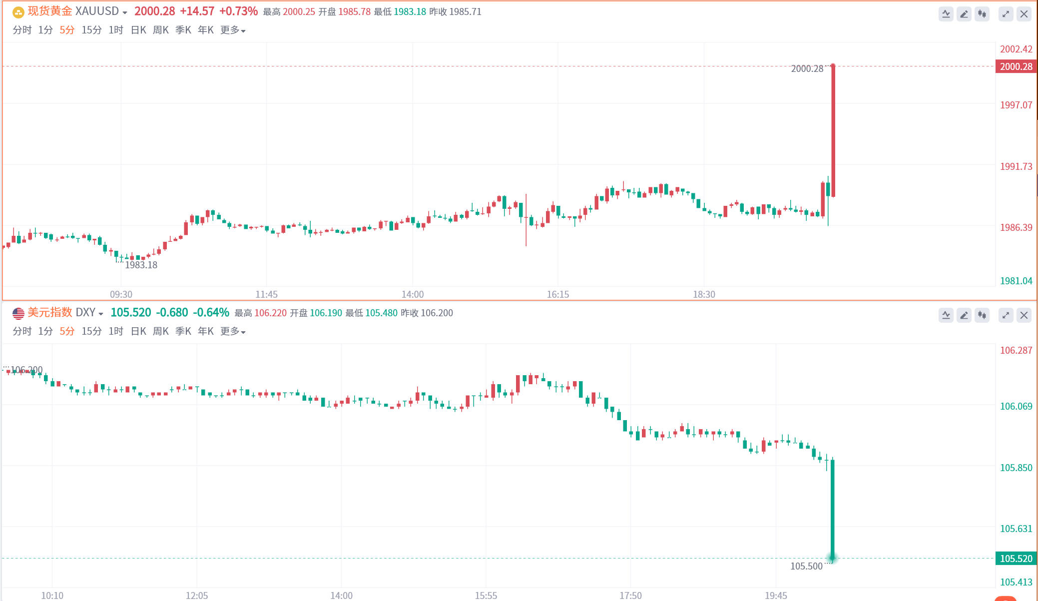 数据公布后,现货黄金短线走高逾10美元美元,站上2000美元大关。现货白银向上触及23美元/盎司,日内涨1.12%。美元指数短线下跌近40点,现报105.51。美元兑加元USD/CAD短线走低30点,现报1.3726。美国国债收益率在非农就业数据发布后下降,10年期国债收益率降至4.578%。两年期国债收益率下降至4.914%,2/10国债收益率曲线倒挂程度加深至40个基点。德国10年期国债收益率下降3.60个基点,报2.676%。意大利10年期国债收益率下降7.2个基点,报4.496%,2年期债券收益率下降2.7个基点,报3.731%。意大利与德国10年期国债收益率差距收窄至187个基点,为自9月以来最低水平。