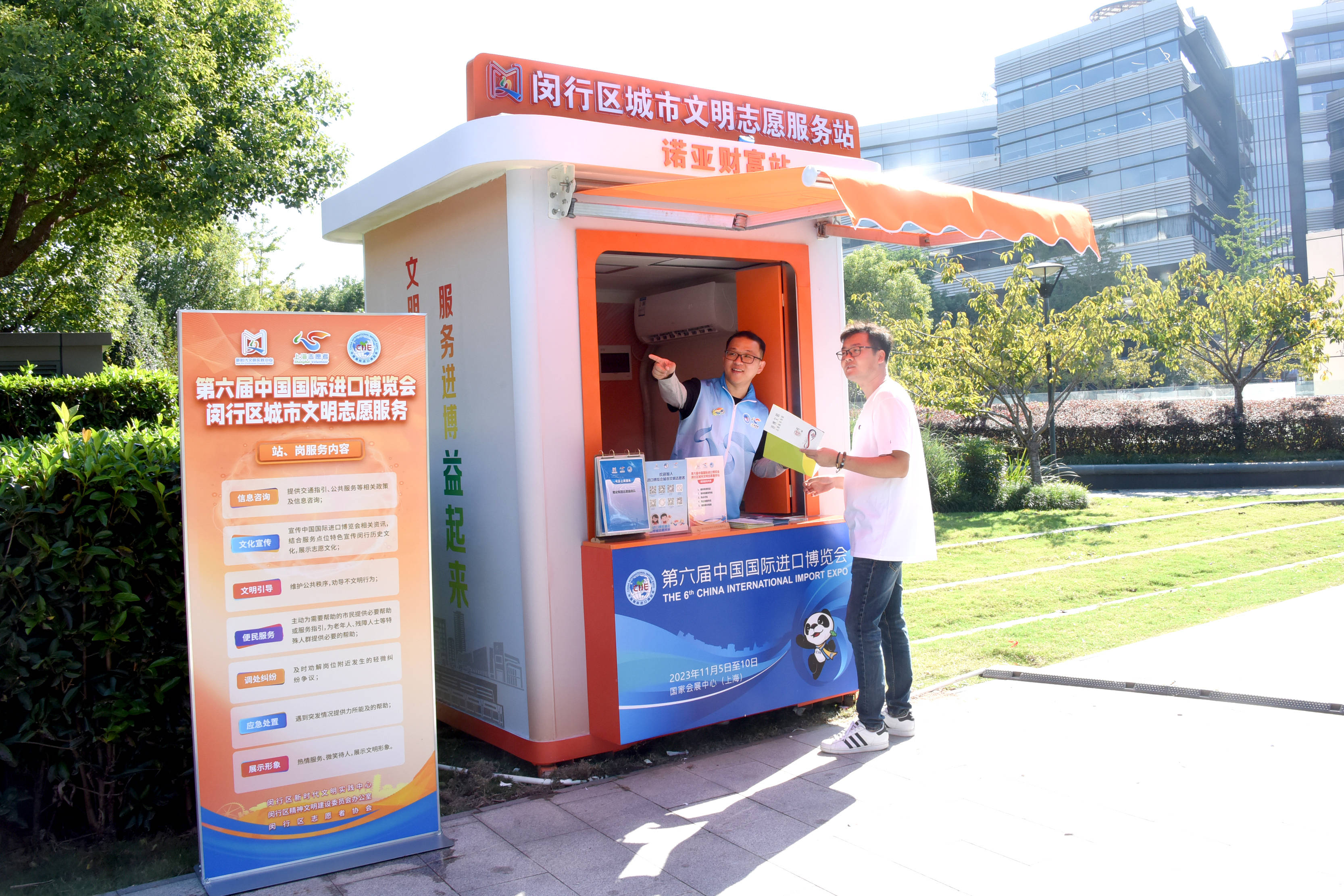 在通往国家会展中心(上海)的二层步道上,让人耳目一新的城市文明志愿服务站亭,成为进博会场馆前一道亮丽风景。来自闵行区道德模范团队和上海市文明单位的志愿者已经上岗服务,他们微笑介绍服务项目,站内有序摆放着的便民药箱、热水壶、便民伞、口罩、免洗洗手液、周边指引地图、进博会宣传折页等服务用品,方便过往宾客需要时取用。途经现场的多位参展商在取用周边指引地图后,纷纷表示这个服务非常好,展览还没正式开幕,他们就享受到了周到的服务。