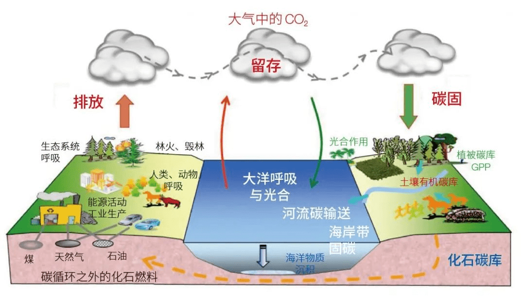 碳循环,它是自然生态系统的自带循环体系,通过排放、留存、碳固的循环作用,让碳元素循环于生物圈、岩石圈、水圈及大气圈。然而,自工业革命以来,人类的工业生产活动大大加快了碳从化石燃料进入大气(排放)的速率和体量,并同时通过对土地资源的改造和利用大大减少了可通过光合作用来将大气中的碳重新固入土壤内(碳固)的植物——于是,自然生态系统自带的碳循环体系失去了平衡,并进而使得生态环境和气候产生负面反应(海水酸化、温室效应、极端气候事件等)。这些负面反应,也最终对人类的生存造成了负面影响。