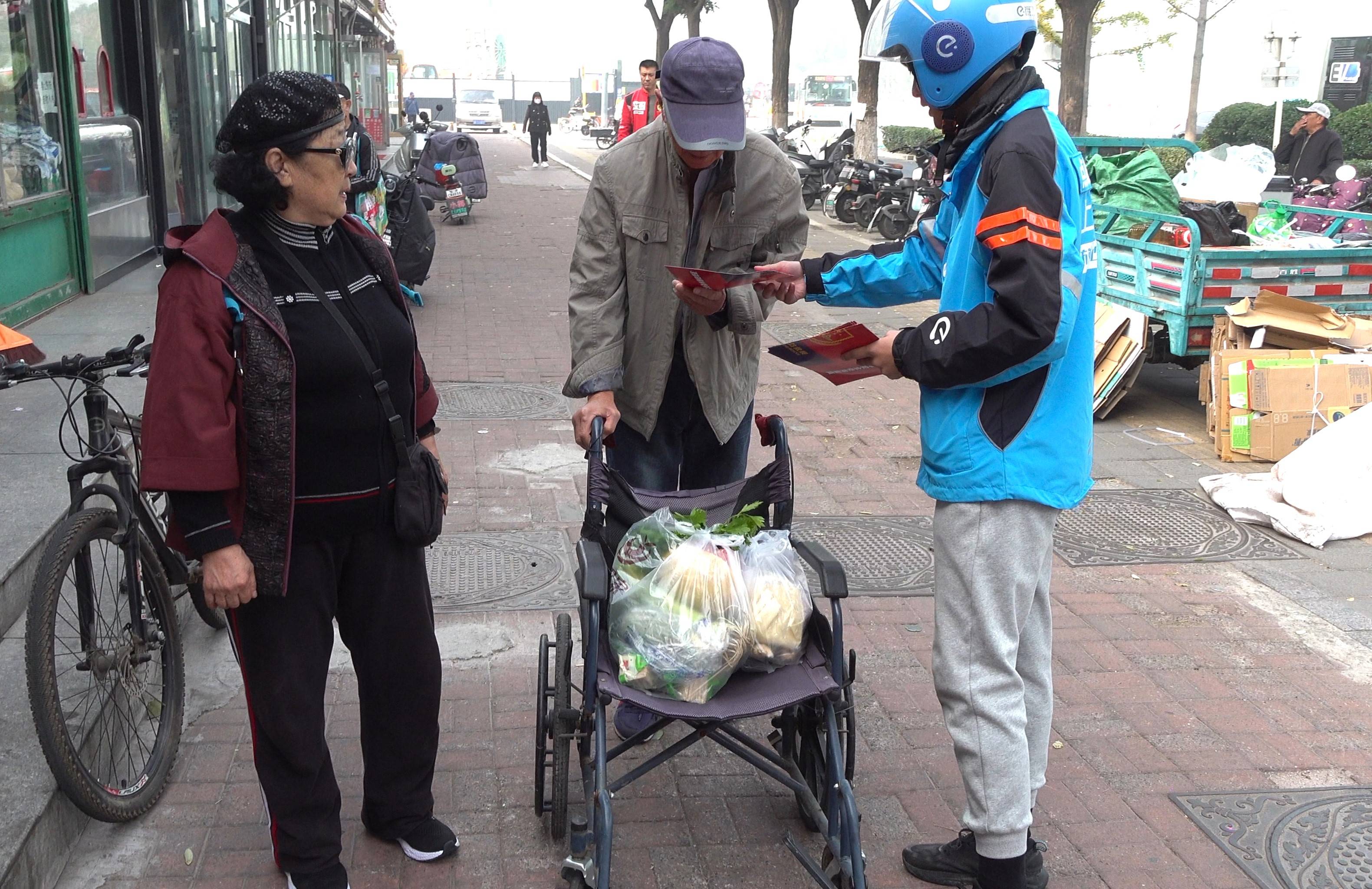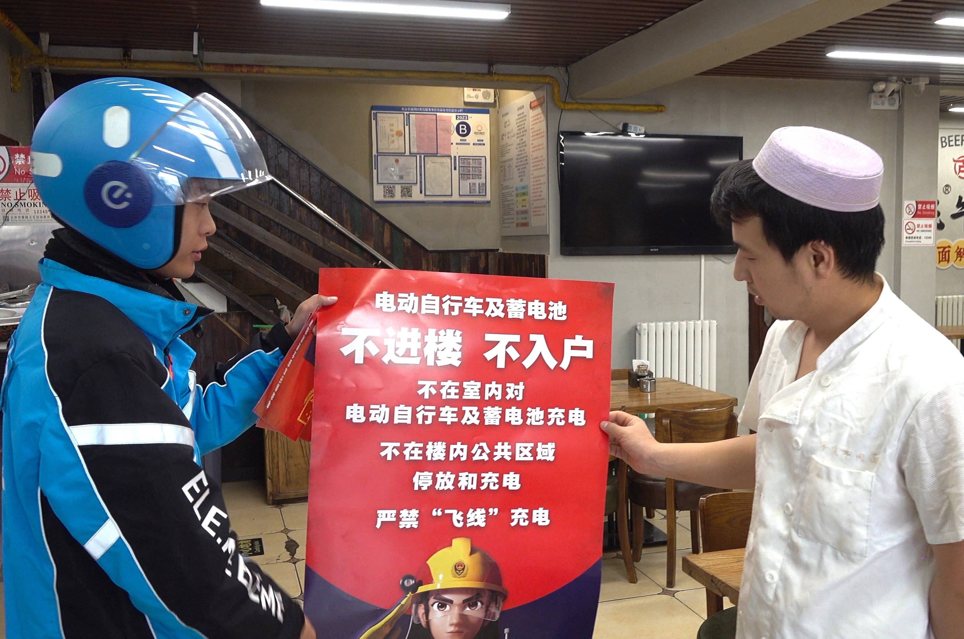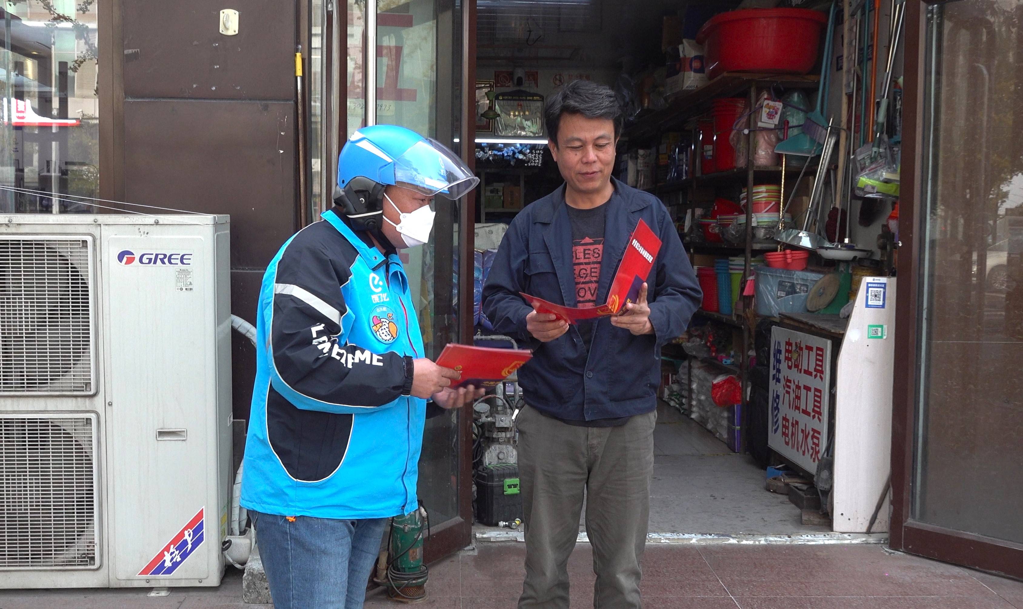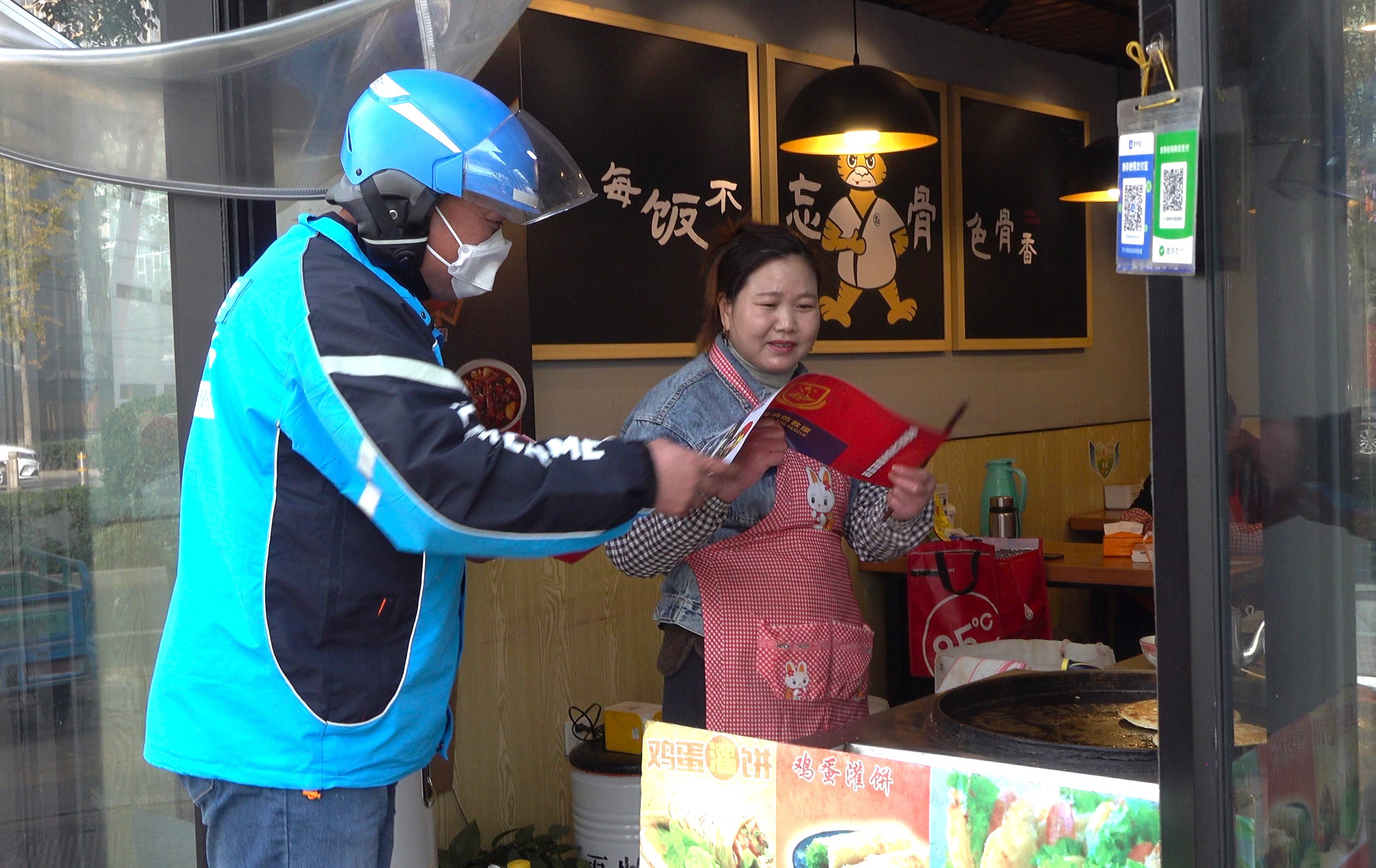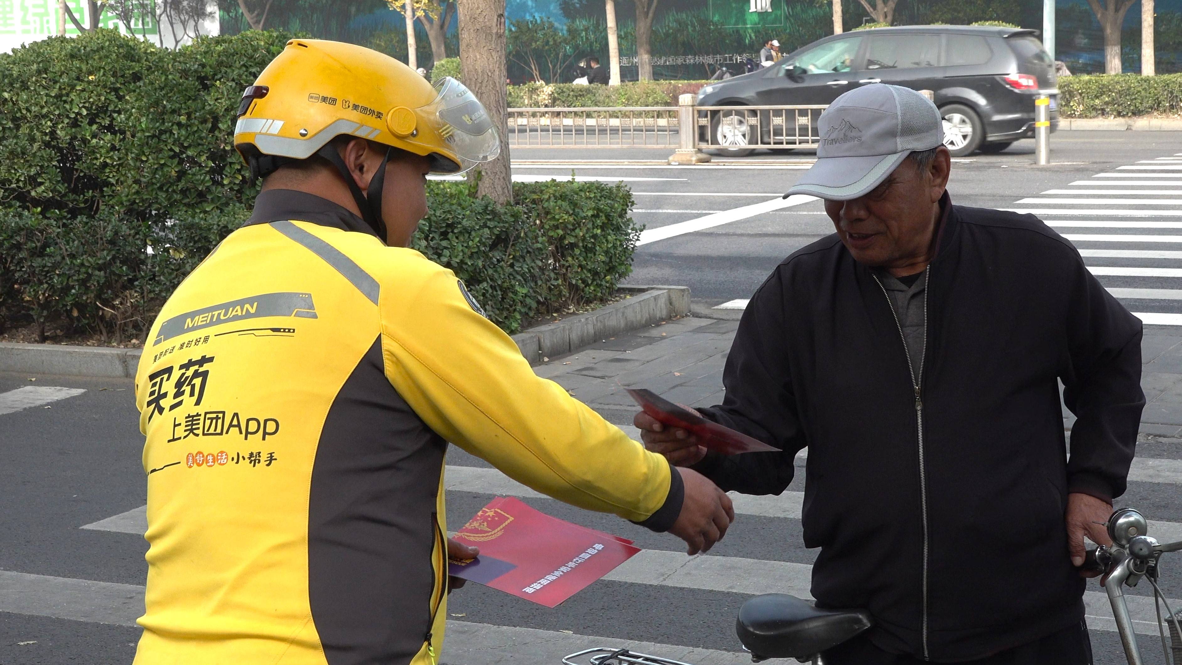 “您好,我们是美团消防志愿服务队队员,这是送您的消防宣传材料,请您看一看,学一点消防知识,增添一份平安。”美团外卖的配送员正在对一家商户的负责人发放消防宣传材料。