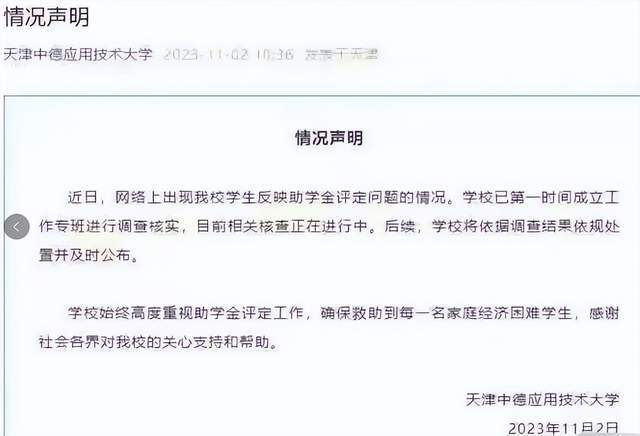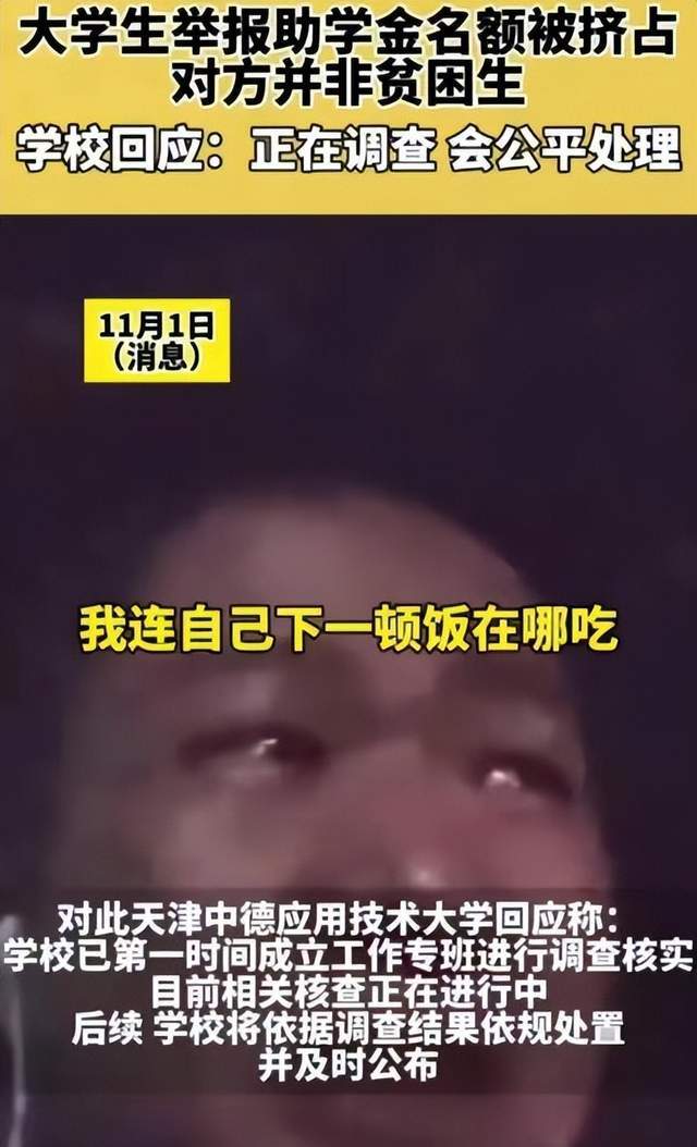 最近天津中德应用技术大学一位学生的哭诉引起了社会的广泛关注,这位大学生在视频中实名举报了班级里的助学金名额分配存在着不公的现象。甚至在讲这件事的时候,他也是多次激动落泪,看得不少人心酸不已,因此很多网友都要求教育局和有关部门介入调查,不过11月3日这天疑似被他举报的学生,也在网上发声回应。