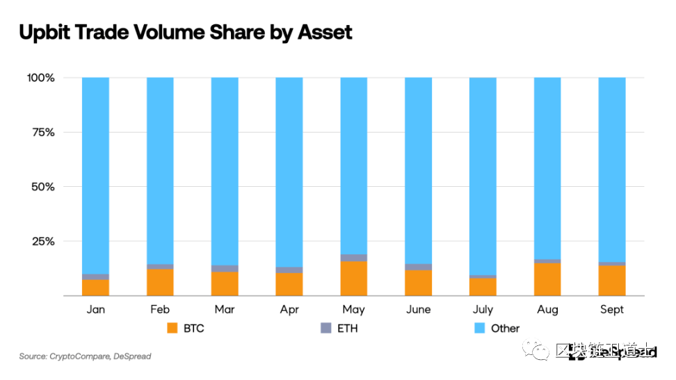 尽管 Upbit 的 BTC 和 ETH 交易量只占总交易量的一小部分,但 Coinbase 交易所这两种加密货币的交易量占比较大。Upbit 上的大多数个人投资者对具有高盈利潜力的山寨币表现出浓厚的兴趣,并倾向于接受相关的高风险。这也被认为是韩国市场中山寨币交易占比较高的原因之一。