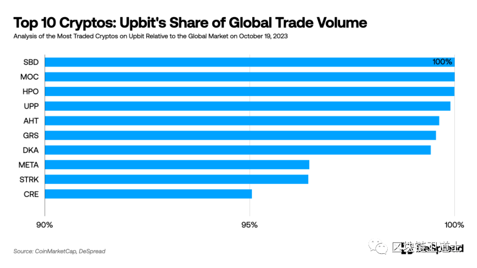在 Upbit 上交易的加密货币中,Steem Dollars($SBD)、Moss Coin($MOC)和 Hippocrat($HPO)占全球交易量的 100%,并且只在 Upbit 上交易 。此外,Sentinel Protocol ($UPP)、Aha Token ($AHT) 和 Groestlcoin ($GRS) 等加密货币也主要在 Upbit 上交易,由于在全球市场上不受关注,因此被称为泡菜币。这些代币主要由韩国投资者进行交易,并在 Upbit 平台上形成了自己的市场。