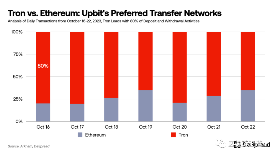 上图显示了过去一周 Upbit 用户使用以太坊和 Tron 网络进行存取款的交易比例。数据显示,Tron 网络上的交易量是以太坊的 5 倍。