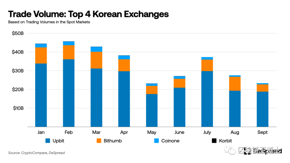 韩国交易所也不例外。总交易量在 2 月份达到 450 亿美元的峰值后,5 月份急剧下降至 230 亿美元。但此后又呈现出上升趋势,7 月份交易量高达 370 亿美元,与全球最大的加密货币交易所 Binance 相比增幅更大。