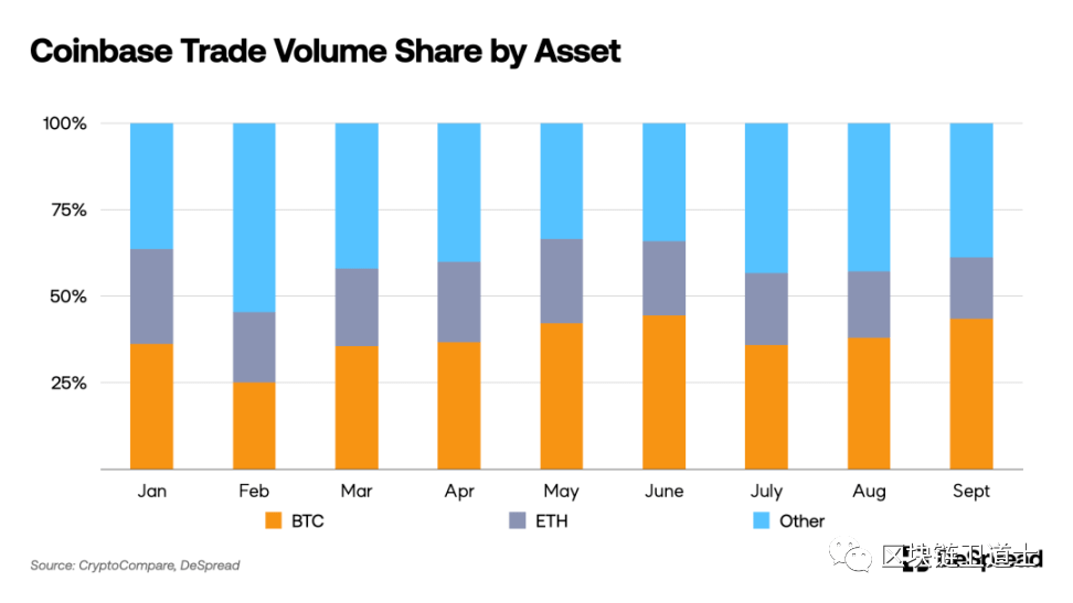 与个人投资者占主导地位的 Upbit 不同,Coinbase 的交易量由机构投资者推动。根据 Coinbase 的第二季度股东信,机构投资者约占 Coinbase 总交易量的 85%。他们倾向于追求投资组合的稳定性,这就是为什么 BTC 和 ETH 的交易占据了相对较高比例的原因。