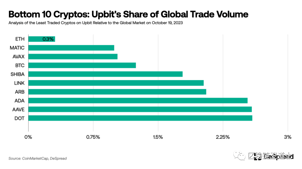 主导全球市场的加密货币,如 BTC、ETH 和 MATIC,在全球范围内拥有大量交易量。然而,在 Upbit 交易所,它们的交易量却出奇地低。这一现象表明 Upbit 与全球市场相比具有独特的特征,反映了投资者偏好和投资策略的地区差异。不过,需要注意的是,与 Binance 等全球巨头交易所相比,Upbit 的总交易量相对较低,因此这些主要加密货币的低交易量也应考虑在内。