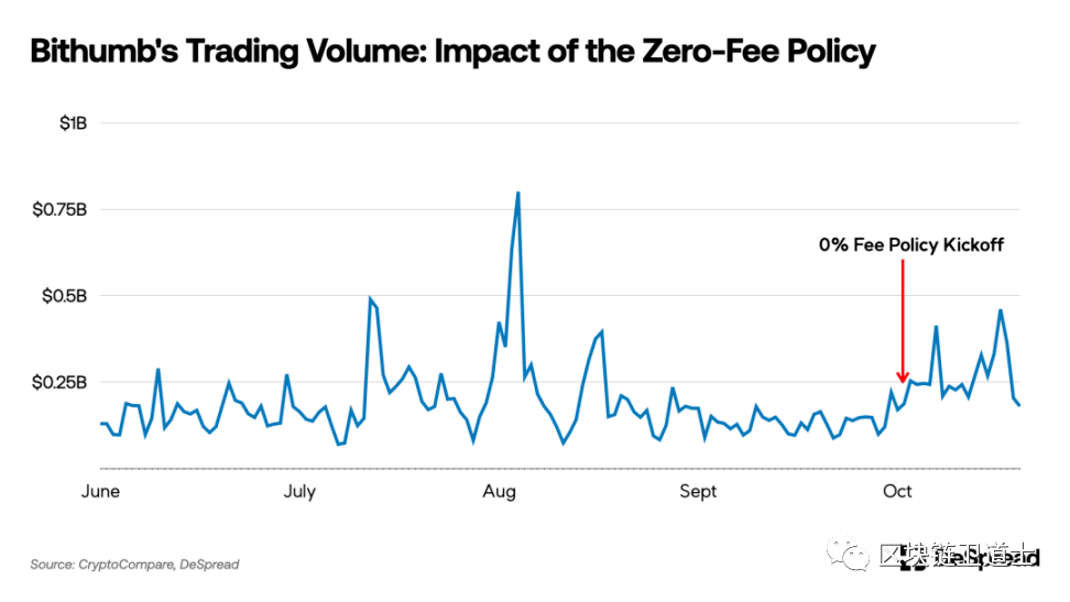 韩国第二大交易所 Bithumb 于 10 月 4 日实施 0 手续费政策。这一政策最初产生了积极影响,Bithumb 的交易量增加,市场份额超过 20%。